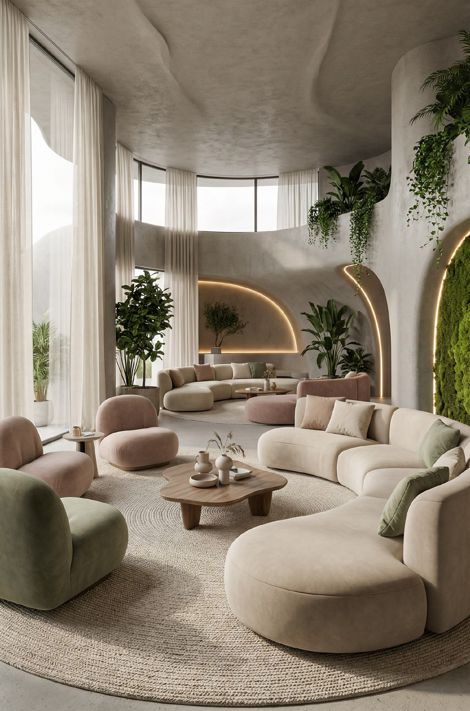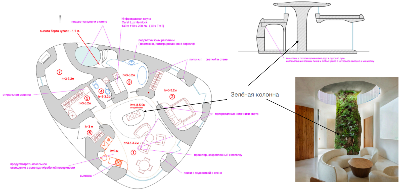 Биофильный дизайн по Мельникову: плавные линии, округлые формы. Дерево, камень, жадеит, «живые» стены с фитонцидами — меньше стресса по исследованиям.